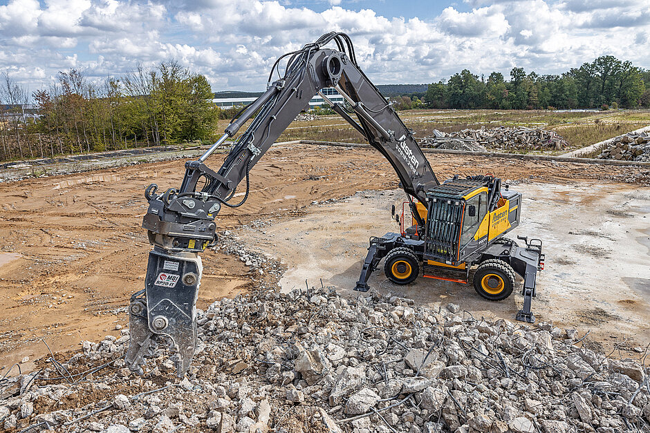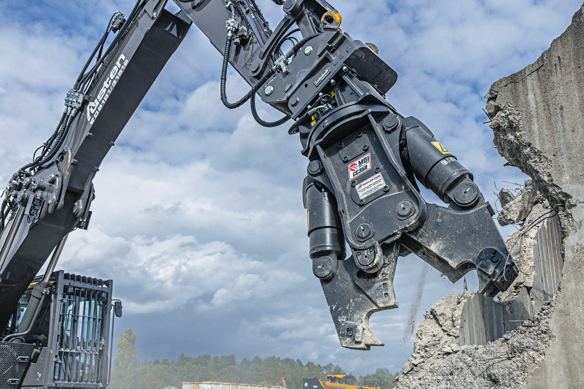 Die neue MBI-Kombischere CC35-R mit einem Einsatzgewicht von 3 500 kg und einer Öffnungsweite von 1 100 mm eignet sich neben dem Einsatz bei herkömmlichen Abbrucharbeiten auch zum Knacken von Fundamenten.