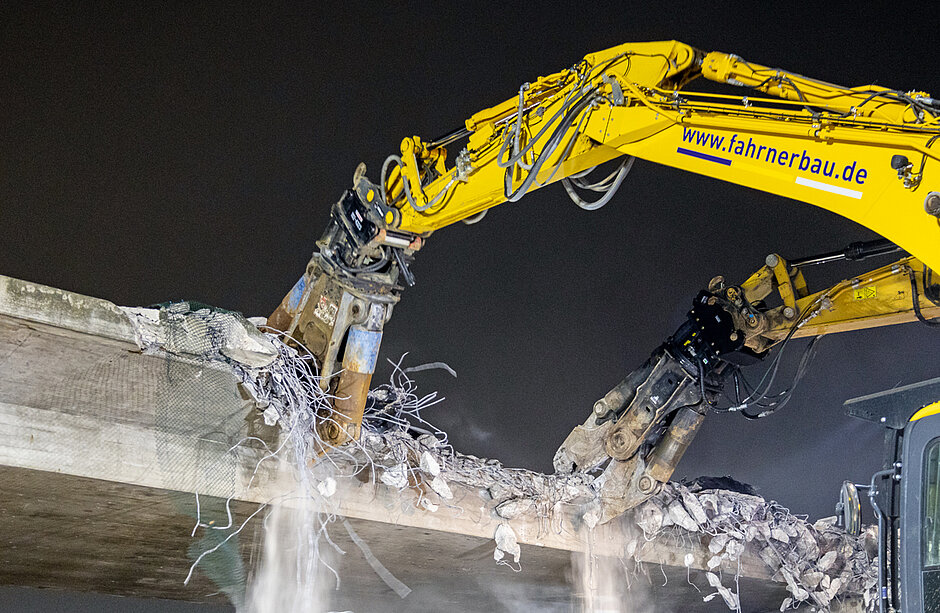 Seit bereits mehreren Jahren setzt Fahrner bei Brückenabbrüchen auf die betriebseigene, 4 700 kg schwere Abbruchzange des MBI-Typs CR40R in Kombination mit dem drehbaren Pulverisierer RP40-IT. Doch um den Abbruch der Fahrbahn der B 8 über die A 3 bewältigen zu können, bedurfte es der Miete zweier weiterer großer Anbaugeräte. Im Beratungsgespräch mit Johann Paulus, Geschäftsführer des langjährigen MBI-Händlers Hydraulik-Paule, erwies sich der Einsatz einer weiteren CR40R sowie einer MS50-CC als optimale Lösung für den Einsatzfall.