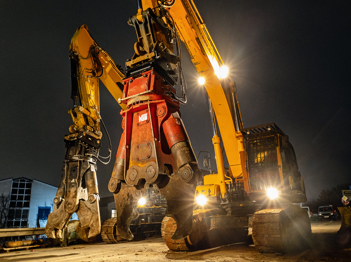 Das Multisystem MS50R feierte im Sommer vergangenen Jahres Weltpremiere und hat sich seitdem mit dem CC-Gebiss im schweren Betonabbruch bewährt. Die 5 300 kg schwere Abbruchschere ist für Trägergeräte von 45 t bis 55 t konzipiert. Die Aufbereitung der angefallenen Abbruchmaterialien übernahm ein 4 100 kg schwerer drehbarer Pulverisierer vom Typ RP40-IT.