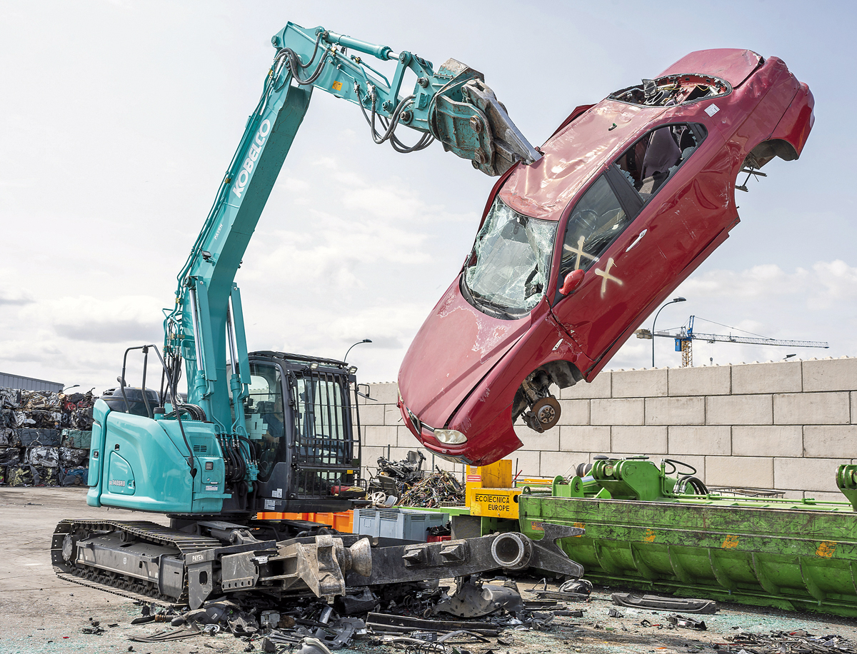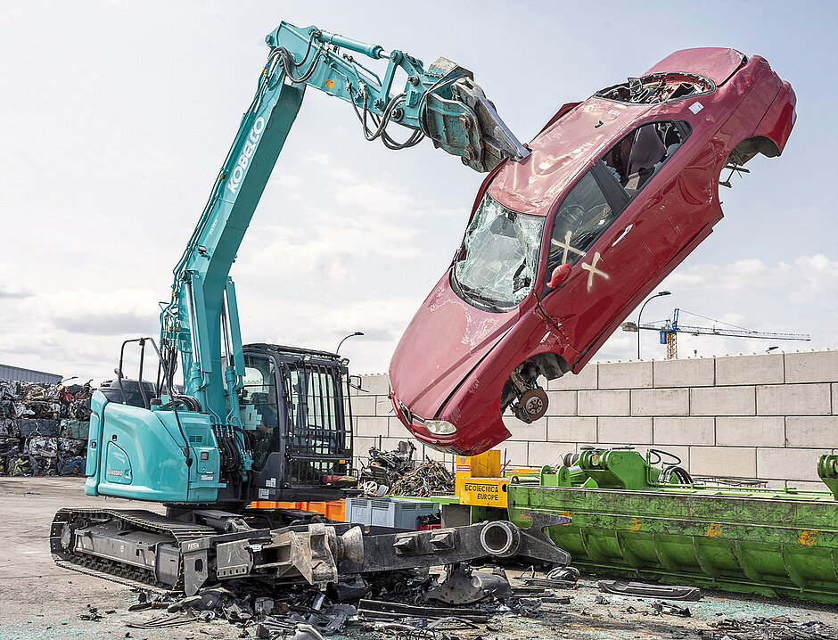 Laut Dominik Erath ist das Bagger-Schere-Verfahren im direkten Vergleich zur manuellen Schneidbrenner-Zerkleinerung um bis zu 60 % wirtschaftlicher. »Und das bei ungleich besseren Voraussetzungen für das Personal und die Umwelt.« Die erklärte Zielsetzung beider Hersteller ist es, höhere Produktivität bei gleichzeitig steigender Wertschöpfung zu erreichen. Dieses Ziel verfolgen auch die Demontagebagger von Kobelco, die vom japanischen Baumaschinenhersteller insbesondere für Verwertungsbetriebe entwickelt wurden. Am Unterwagen findet sich eine Klemmzange, die das Altfahrzeug fixiert und diverse Werkzeuge zum Lösen und Schneiden von Einzelkomponenten wie etwa Kabelbäumen bietet. Die spezielle Demontageschere soll laut Hanns-Markus Renz »ein sehr schnelles Zerlegen von Karosserien bei fachgerechter Trennung der enthaltenen Wert- und Reststoffe ermöglichen«.