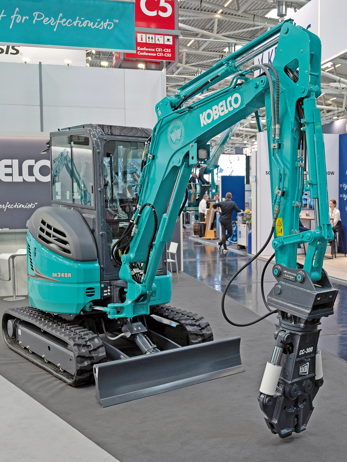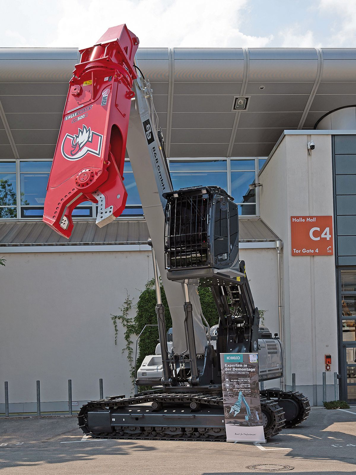 Noch leistungsfähiger soll der Kobelco-Vierzigtonner im Zusammenspiel mit einer direkt am Ausleger montierten Schrottschere sein. In München zeigten Kobelco und MBI diese »Customized«-Lösung, die vom Kobelco-Händler Thomas Baumaschinen aufgebaut wurde. Unter anderem erhielt das Grundgerät mit gestrecktem Ausleger eine Tele-Kippkabine, Zentralschmierung, Kettenabstreifer sowie weitere Sonderlösungen auf Kundenwunsch. Bei der bedarfsgerechten Zerkleinerung unterschiedlichster Stahlkonstruktionen, kompletter Fahrzeuge oder Maschinenkomponenten ist die rund 6 t schwere MBI-Schrottschere MBI SH600R voll in ihrem Element. Mit über 9 000 kN Schneidkraft trennt sie auch schwere Stahlträger und -rohre, was laut Dominik Erath die Bereitstellung von sortenreinen und maßgerechten Recycling-Stählen bereits vor der Anlieferung oder direkt im Stahlwerk erleichtert.