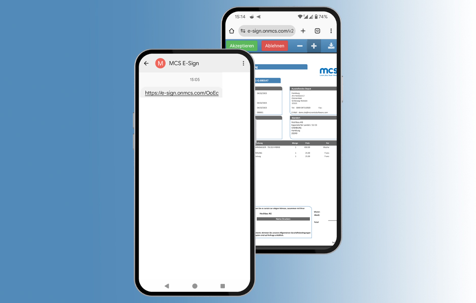 Bei MCS eSign handelt es sich um eine bereits bewährte Lösung für Vermietunternehmen, die die MCS Rental Software nutzen. Es spart ihnen viel Zeit, da sie Angebote, Verträge und Schadensmeldungen digital unterzeichnen lassen können. Das Ausdrucken, Scannen und Versenden per E-Mail entfällt. Mit der neuesten Version von MCS eSign können Unterschriften nun auch per SMS angefordert werden, was den Prozess noch weiter vereinfacht. Nick Thomson, Vertriebsleiter bei MCS, sagt dazu: „Wir haben bereits sehr positives Feedback von Kunden erhalten, die rechtsgültige Verträge mit ihren Kunden abschließen konnten. Allerdings spielt sich das Geschäft mit der Gerätevermietung nicht nur im Büro ab. In der Realität sind die Leute oft unterwegs, auf der Baustelle oder im Lager, und nicht am Computer, um Dokumente digital zu unterschreiben und zurückzusenden. Mit der Möglichkeit, eSign-Anfragen per SMS zu versenden, können Endkunden Dokumente jetzt auch unterwegs auf ihrem Mobiltelefon unterschreiben."