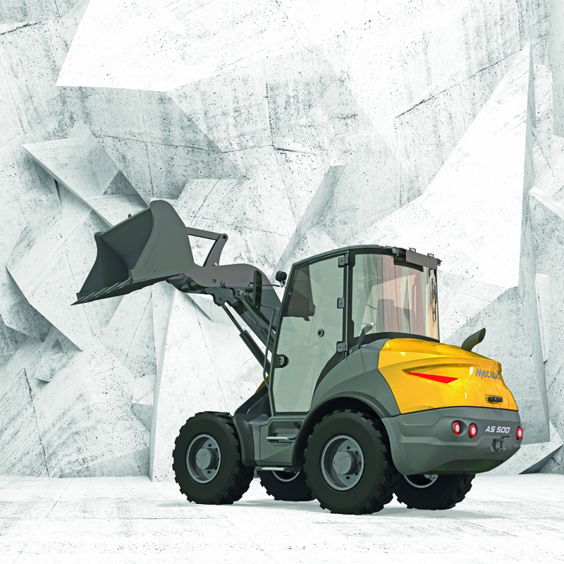 Zur Bauma stößt nun der AS 500 zum Sortiment der Mecalac-Schwenklader, ausgestattet ist er mit einem Deutz-Motor der Stufe V (30 kW bzw. 40 PS), einer 500-l-Ladeschaufel und einer serienmäßigen Zusatzhydraulik. Die geräumige Kabine mit getönten Scheiben ist von beiden Seiten zugänglich. Die Bedienelemente sind ergonomisch angeordnet. Zwei große, klappbare Außenspiegel unterstützen die Sicht auf die Arbeitsumgebung. Das Panoramadach ist eine Hilfe bei Ladearbeiten in der Höhe. Der Fahrersitz im AS 500 entspricht den aktuellen Standards in Sachen Ergonomie und Komfort, eine leistungsstarke regulierbare Klimaanlage und Heizung machen die tägliche Arbeit angenehmer.