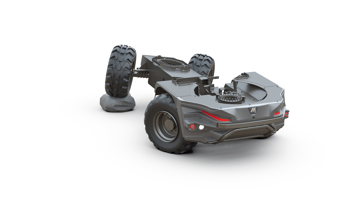 Inspiriert von Hangtraktoren, will der Revotruck eine außergewöhnliche Stabilität bieten. Ein zentrales Gestänge zwischen den beiden Teilen des Fahrgestells bietet eine Oszillation von bis zu 18° und unterstützt so für Stabilität und Traktion. Vervollständigt wird das Fahrgestell durch vier gleich große Räder und eine umschaltbare Lenkung (Front-, Allrad- und Hundeganglenkung). t