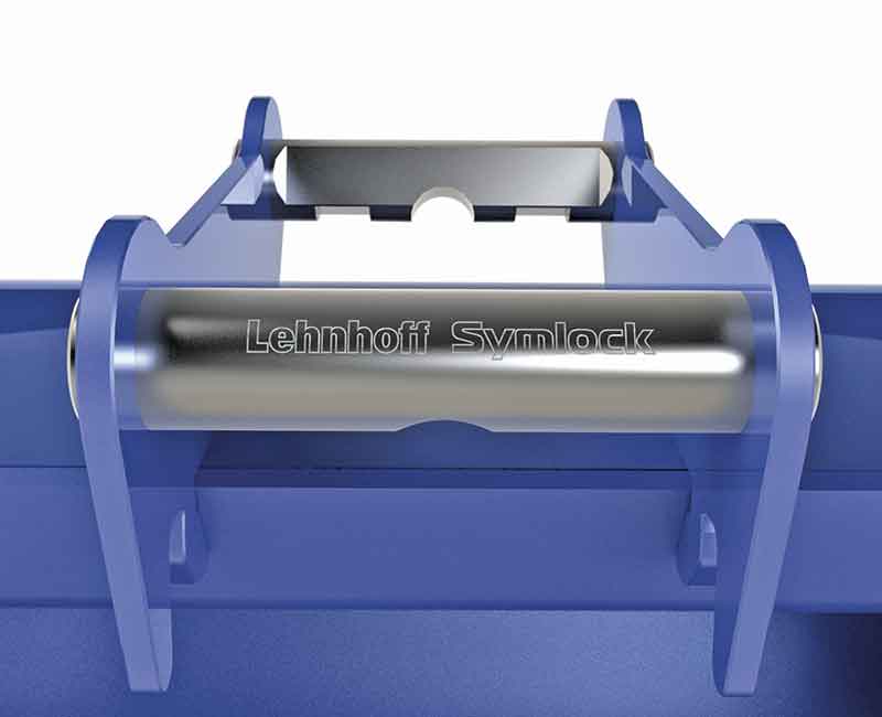 Die Besonderheit des Symlock-Adapters – das Drehen der Anbaugeräte – wird durch die Doppelung der Verriegelungskomponenten möglich. Zwei symmetrisch angeordnete Wellen, die jeweils alle Elemente zur Aufnahme von Klaue, Riegelbolzen und Riegelfläche besitzen, erlauben den Anbau der Löffel in beide Richtungen. Diesem technischen Umstand verdankt der Symlock-Adapter seine Namensgebung: er ist eine Verknüpfung aus den Wörtern »Symmetrie« und »to lock« – zu deutsch »verriegeln«. Um effizient und sicher arbeiten zu können, müssen Symlock-Adapter und Schnellwechsler fest miteinander verbunden sein. Lehnhoff setzt hier, wie beim herkömmlichen Lehmatic-Adapter, auf eine keilförmige Verriegelung: Die Riegelbolzen des Schnellwechslers klemmen sich in die Aussparungen an der Unterseite der Aufnahmewelle des Symlock-Adapters. Gleichzeitig wird die Riegelfläche des Schnellwechslers durch eine leichte Konizität der Bolzen in die schräge Anflachung an der Welle gezogen und so ein spielfreier Kraftschluss erzeugt. Die Symlock-Wellen fertigt Lehnhoff CNC-gesteuert aus Vergütungsstahl, was eine absolute Passgenauigkeit, einen spielfreien Sitz des Löffels und höchste Standzeiten garantieren hilft. Entsprechend gewährt das Unternehmen eine Garantie von fünf Jahren auf den spielfreien Sitz des Schnellwechslers im Adapter, wenn Lehnhoff-Schnellwechslerkomponenten verwendet wurden.