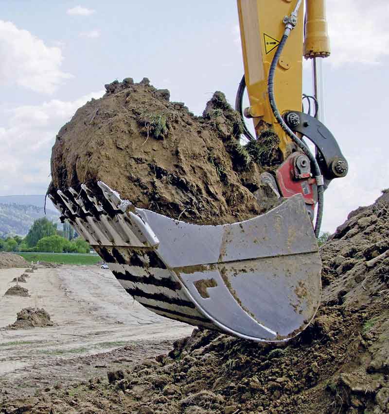 Der Symlock-Adapter ist kompatibel mit allen mechanischen, hydraulisch betätigten und vollhydraulischen Variolock-Schnellwechselsystemen von Lehnhoff und für Mini- und Kompaktbagger bis maximal 12 t geeignet. Er kann beispielsweise den Aushub von Schächten und Gräben deutlich erleichtern. Sind Rohre im Weg, genügt ein kurzes Absetzen und Drehen des Löffels, um nun in der Hochlöffel-Position das Material unter dem Hindernis ausheben zu können. Auch das Verfüllen und Ankippen von Material direkt an Hauswänden wird mit der Löffeldrehung flexibler. Im Hochlöffeleinsatz können so beispielsweise auch spezielle Laderfunktionen wie zum Auffüllen von Dachsubstrat auf einem zu begrünenden Flachdach übernommen werden.TeamplayerlEin Tieflöffel ist ein Teamplayer, der, gemeinsam mit dem Bagger, möglichst dauerhaft die maximale Leistung erbringen muss. Form und Material spielen dabei eine entscheidende Rolle. Eindringen, Füllen, Entleeren, jede dieser Grabphasen stellt seine spezifischen Anforderungen an die Konstruktion.