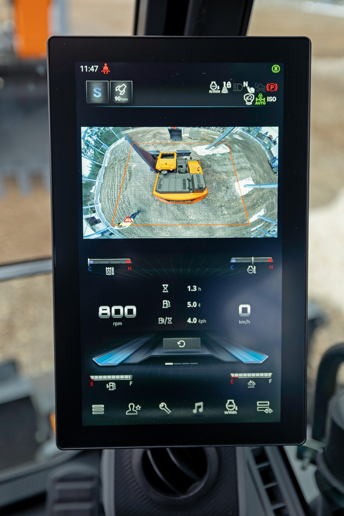 Im neuen Kabineninnenraum profitieren Bediener nun von einer 12-Zoll-Instrumententafel, die deutlich größer ist als die bisherige 8-Zoll-Variante. Das Display zeichnet sich laut Develon aufgrund der Full-HD-Auflösung (1 920 x 1 080) sowie des Betriebssystems Android 10 durch eine scharfe und damit besonders deutliche Darstellung aus. Die neue Split-Screen-Funktion ermöglicht die gleichzeitige Darstellung mehrerer Funktionen auf einer Oberfläche, was die Betriebseffizienz erhöht. Die bessere Ablesbarkeit des Displays reduziert die Belastung und Ermüdung der Augen. Wichtige Informationen werden klarer präsentiert, was letztlich die Sicherheit des Maschinenbetriebs erhöht und diesen optimiert.