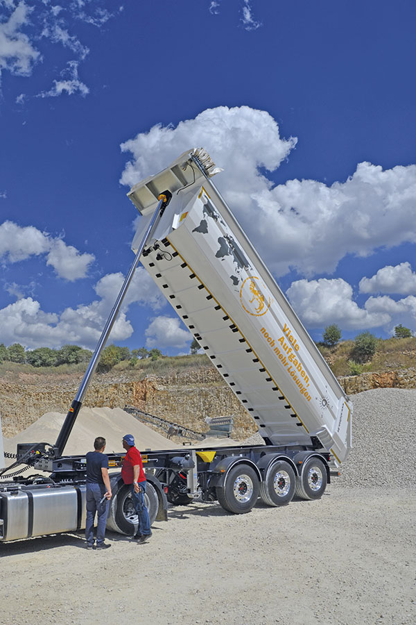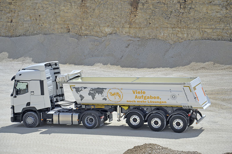 Mindestens ebenso viel Nutzen wie die Modularität stiftet die in Finite-Elemente-Berechnungen optimierte Rahmenstruktur. Diese weist an den entscheidenden Stellen, etwa über den Achsanbindungen oder im Heck Verstärkungen auf, verzichtet aber an anderen Stellen auf unnötiges Material und trägt so zum niedrigen Leergewicht des Fahrzeugs bei. Ausgestattet mit optionalen Alu-Felgen, optionalen Alu-Druckbehältern, zwei Aluminium-Fallstützen sowie mit einem ebenso auf Wunsch erhältlichen, elektrischen Schiebedach der Marke Marcolin, bringt es der Wielton-Kipper mit 24-m³-Aluminiummulde auf ein Leergewicht von weniger als 4 750 kg.