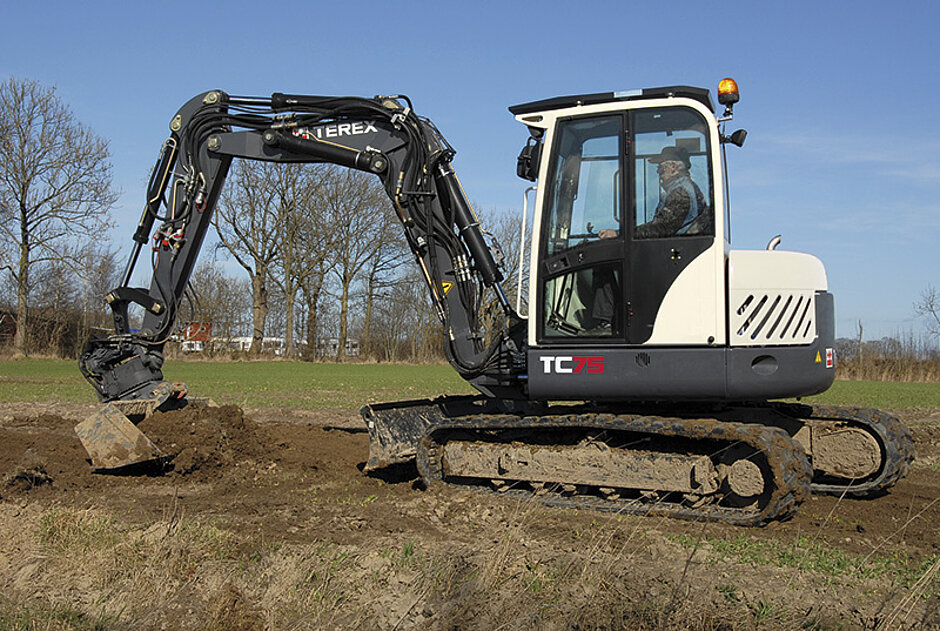 Der neue TC75 verfügt über die Terex-Loadsensing-Hydraulik mit lastunabhängiger Durchflussverteilung, die eine gleichzeitige Nutzung aller Funktionen ermöglicht, wobei der verfügbare Ölstrom nach Vorgabe des Bedieners proportional verteilt wird. Ein weiterer Vorteil ist die von Terex entwickelte Knickmatik (63° links, 65° rechts), die das Arbeiten eng an der Wand über die gesamte Breite der Maschine ermöglicht.