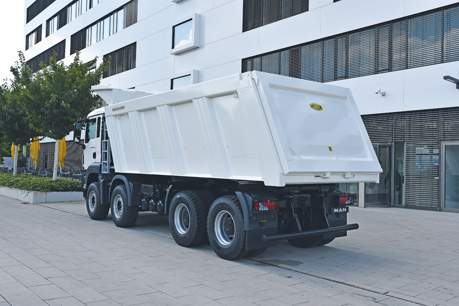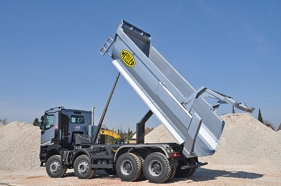 Unterschiede zwischen der P- und H-Baureihe gibt es bei Meiller vor allem in der Muldenform. Die P-Reihe verfügt über eine halbrunde Muldenform, wodurch das Schüttgut beim Entladen optimal abfließen soll. Ein großer Kippwinkel unterstützt das zügige Entladen des Schüttguts weiter. Gleichzeitig soll die zentrale Position der Ladung in der Mulde für eine optimale Straßenlage und für gute Fahreigenschaften des Vierachsers sorgen. Viele Detaillösungen führen zudem zu einem auf Nutzlast getrimmten Aufbau. Im Gegensatz zur P-Reihe weist die Mulde der H-Serie eine eckige Form auf, um noch besser für den harten Einsatz gerüstet zu sein. Sogenannte Jet-Bordwände wollen dem Vierachskipper hohe Stabilität und Langlebigkeit selbst unter rauen Einsatzbedingungen ermöglichen.