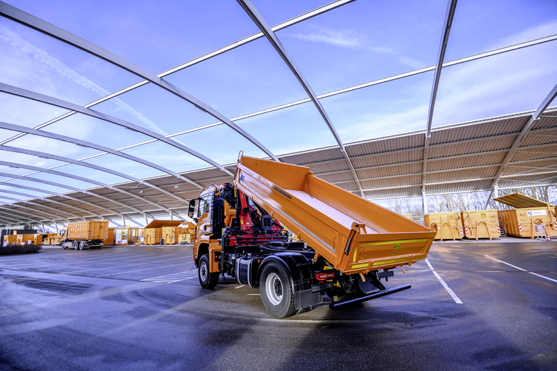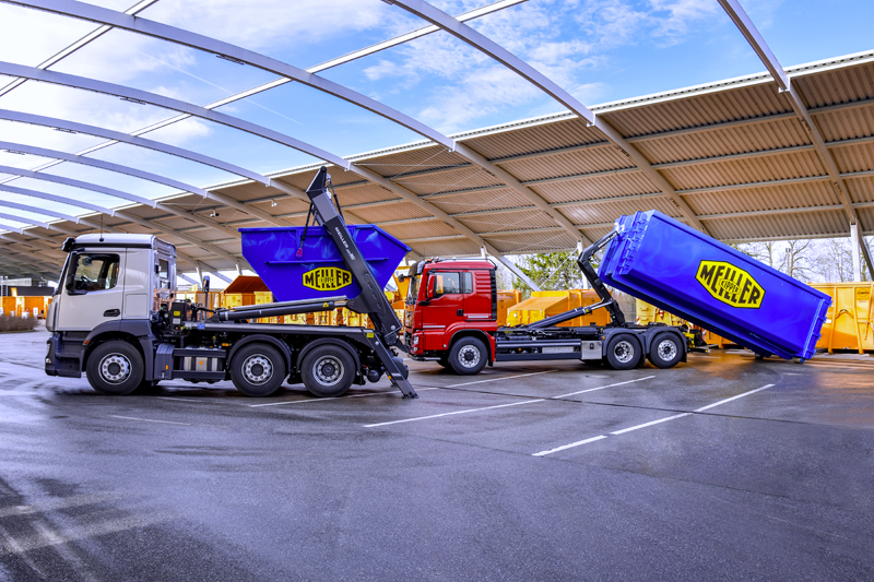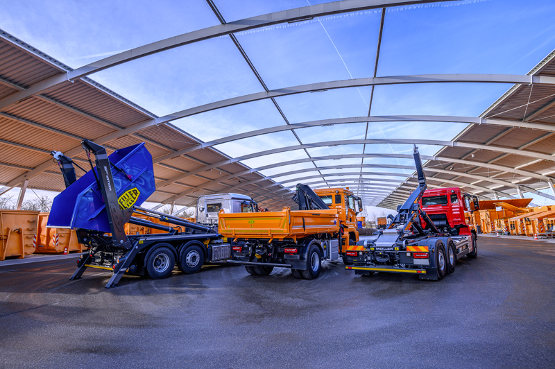 Der MEILLER Abrollkipper RS21 wagt mit innovativer Technik einen großen Sprung nach vorne. Als Schnellster seiner Klasse bietet er mehr Nutzlast und setzt mit seiner Sicherheit neue Standards. Der Abroller überzeugt mit einer Hubkraft von 21 Tonnen, einer Gewichtsersparnis von bis zu 200 Kilogramm und einer niedrigeren Bauhöhe von 20 mm. Diese Vorteile kommen nicht nur der Nutzlast zugute, sondern sorgen auch für eine Verringerung des Kraftstoffverbrauchs sowie einer Steigerung des verfügbaren Ladevolumens. Das Schnellgang-Ventil beschleunigt das Aufziehen des Behälters, sowie das Absenken nach dem Kippen. Das System arbeitet permanent und vollautomatisch lastabhängig, eine Fehlbedienung wird damit ausgeschlossen. Mit einem besonders flachen Hilfsrahmen sitzt der RS21 tief auf dem Fahrgestell, wodurch hohe Container für 100-Kubikmeter-Transporte problemlos, ohne die gesetzlichen Restriktionen zu überschreiten, geladen werden können. Optional wird der Aufbau in der TS-Ausführung, also mit teleskopier- und schwenkbarem Hakenausleger, noch universeller einsetzbar.