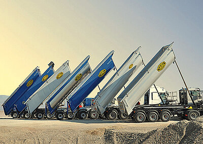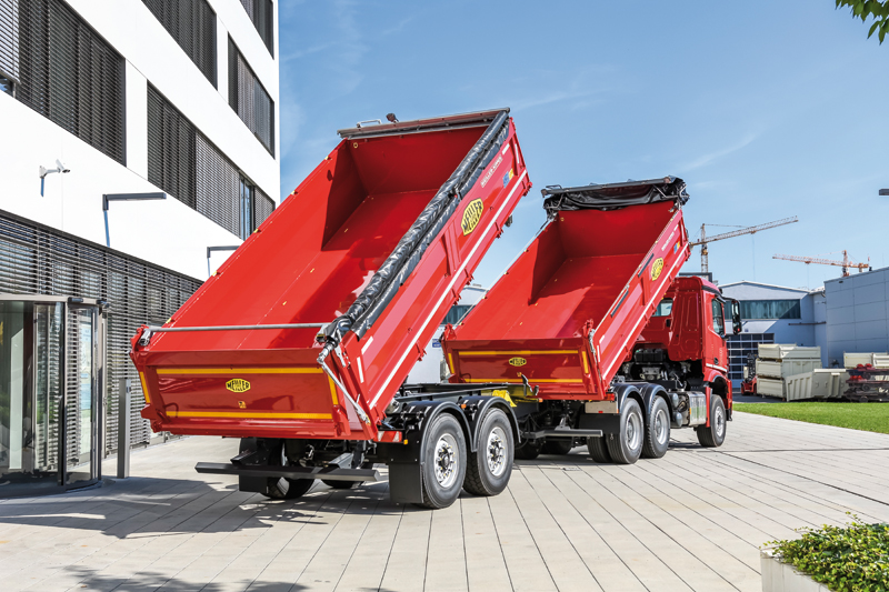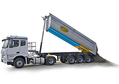 Bei der Hydraulik seines 4-Achser-Zweiseitenkippers setzt Meiller auf die unternehmenseigene 8-Stufen-Presse in Kugelfußausführung, die nicht nur eine deutliche Gewichtseinsparung im Vergleich zu zwei kleineren Pressen verspricht, sondern auch einen geringeren Wartungsaufwand sowie schnelleres Heben und Senken der Kippeinrichtung erlauben soll.