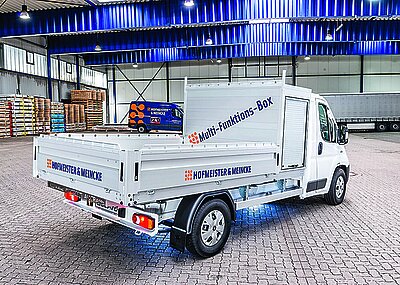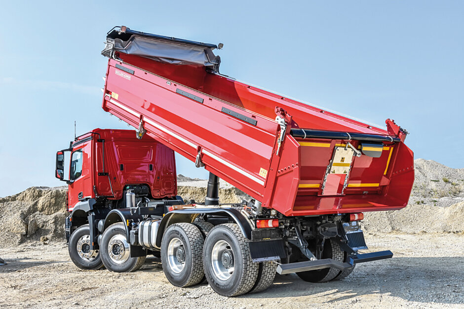 In Sachen Ausstattung gibt es zudem eine pneumatische Trennmittelspritze mit 20-l-Tank zum Reinigen der Kippbrücke, eine Sperre gegen das versehentliche Verriegeln der Bordwand im angekippten Zustand, einen speziellen Einstieg für das leichtere Betreten des Aufbaus, einen Auslauftrichter mit dazugehöriger Werkzeugkiste, Bordwandzurrösen bis 2 t und Stirnwandzurrösen bis 1 t Zugkraft, das Rück- und Laderaumsichtpaket (Kameras in der Kippbrücke und am Fahrzeugheck, je 2 LED) sowie eine elektrische Schiebeplane.