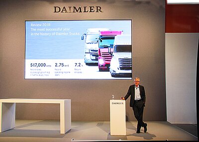 Auf einer über 3.600 Quadratmeter großen Standfläche in der dm-Arena (A 412) sowie auf rund 400 Quadratmeter Außenareal werden Lkw und Transporter aller Gewichtsklassen sowie eine große Auswahl an Aufbauten und Fahrzeugeinrichtungen vorgestellt. Mit insgesamt elf Fahrzeugen ist die Daimler AG darüber hinaus auf der „Kommunalmeile“ im Freigelände vertreten.