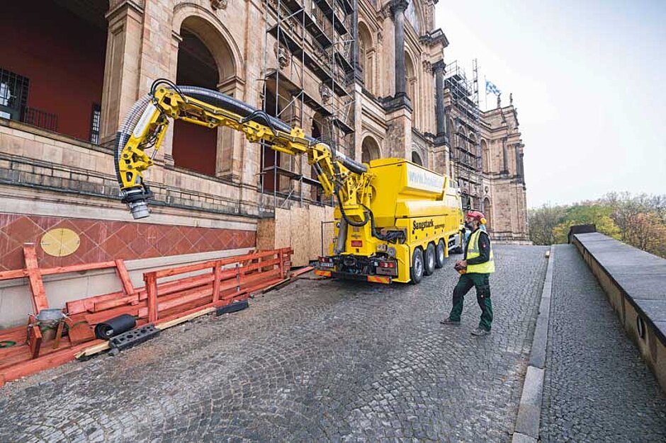 Ohne den Saugbagger müssten die Arbeiter Bauschutt mühsam mit der Schubkarre nach draußen befördern. Doch so schaufelt ein Minibagger das Material lediglich vor das Ende der Schlauchleitung und der Luftstrom des Saugbaggers zieht alles, ob dicke rote Backsteinbrocken oder feines Kalksteingebrösel, nach oben in den 8 m³ fassenden Sammelbehälter auf dem 32-Tonner. Mit einer Umwälzung von bis zu 44 000 m³/h Luft und einem maximalen Unterdruck von knapp 0,45 bar geht es ordentlich voran.