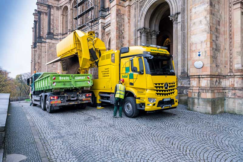 Zuverlässigkeit ist das Stichwort, wenn es um den Motor des Arocs geht. Der weiterentwickelte Reihensechszylinder OM 471 Euro VI mit jetzt 390 kW (530 PS) ist vor allem im kontinuierlichen Saugbetrieb, wie bei der aktuellen Aufgabe, gefordert. Denn obwohl die Firma Hölzl europaweit tätig ist, bekommt das 12,8-l-Aggregat die meisten Betriebsstunden nicht auf der Fahrt, sondern bei der Arbeit im Stand. Auffallend, wie leise der Arocs dabei vor sich hin werkelt. Ein vernehmbares »Getöse« kommt nicht vom Fahrzeug, sondern von den Ventilatoren, dem »Windgeräusch«, der im Aufbau bewegten Luft, und dem angesaugten Material.