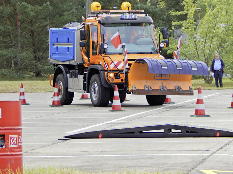 Die Anforderungen umfassten knifflige Situationen aus dem Alltag von Schneepflugfahrern: Slalomstrecken vorwärts und rückwärts und Hindernisse, die passgenau auf definierte Zielpunkte zu schieben waren.