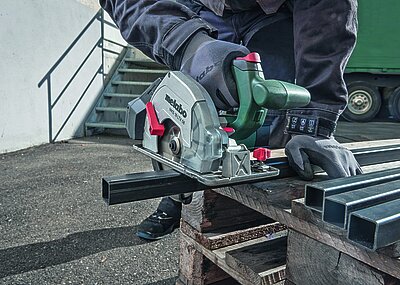 Im Vergleich zu konventionellen Diamanttrennsystemen wiegt der TEPB 19-180 RTCED nur die Hälfte: Mit einem Gewicht von lediglich 3,5 kg einschließlich Absaughaube sieht ihn Metabo als Spitzenreiter am Markt. »Bisher gibt es kein vergleichbares System«, sagt Stoschus. Weil der Diamanttrennschleifer besonders leicht und mit seinem schlanken Griffbereich sicher in der Hand liege, behalte der Anwender in jeder Situation die volle Kontrolle über die Maschine.