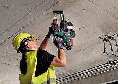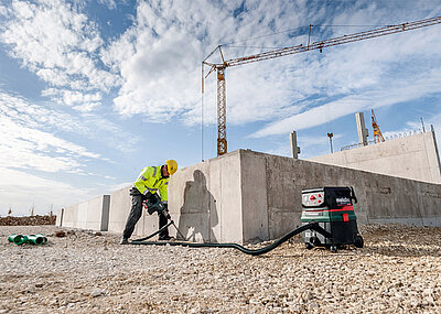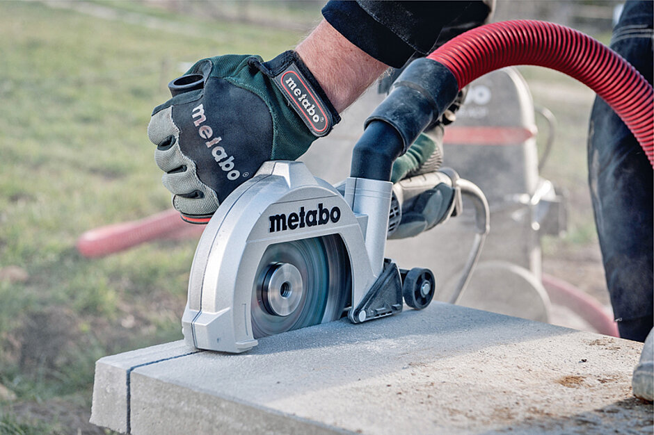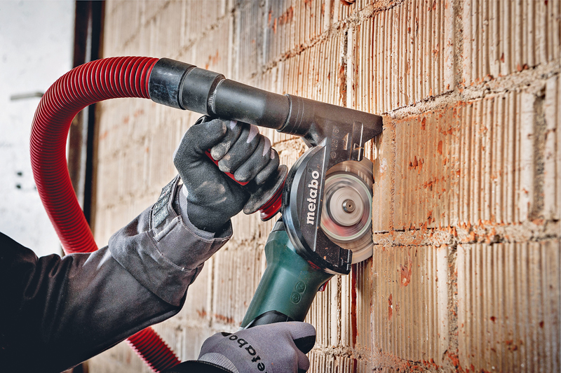 Die von Metabo angebotenen Staubabsaughauben CED 180 und CED 230 sind aus Aluminiumdruckguss gefertigt. Die Trennscheibe kann bei Bedarf durch die Öffnung gewechselt werden, die Haube muss dafür nicht abgenommen werden. Während des Arbeitseinsatzes wird der Staub durch den angeschlossenen, 4 m langen Antistatikschlauch in den Sauger abtransportiert – beispielsweise in den Allessauger ASR 35 M ACP, der sich dank M-Klasse-Filter für den Beton- und Gesteinsstaub auf der Baustelle eignet.