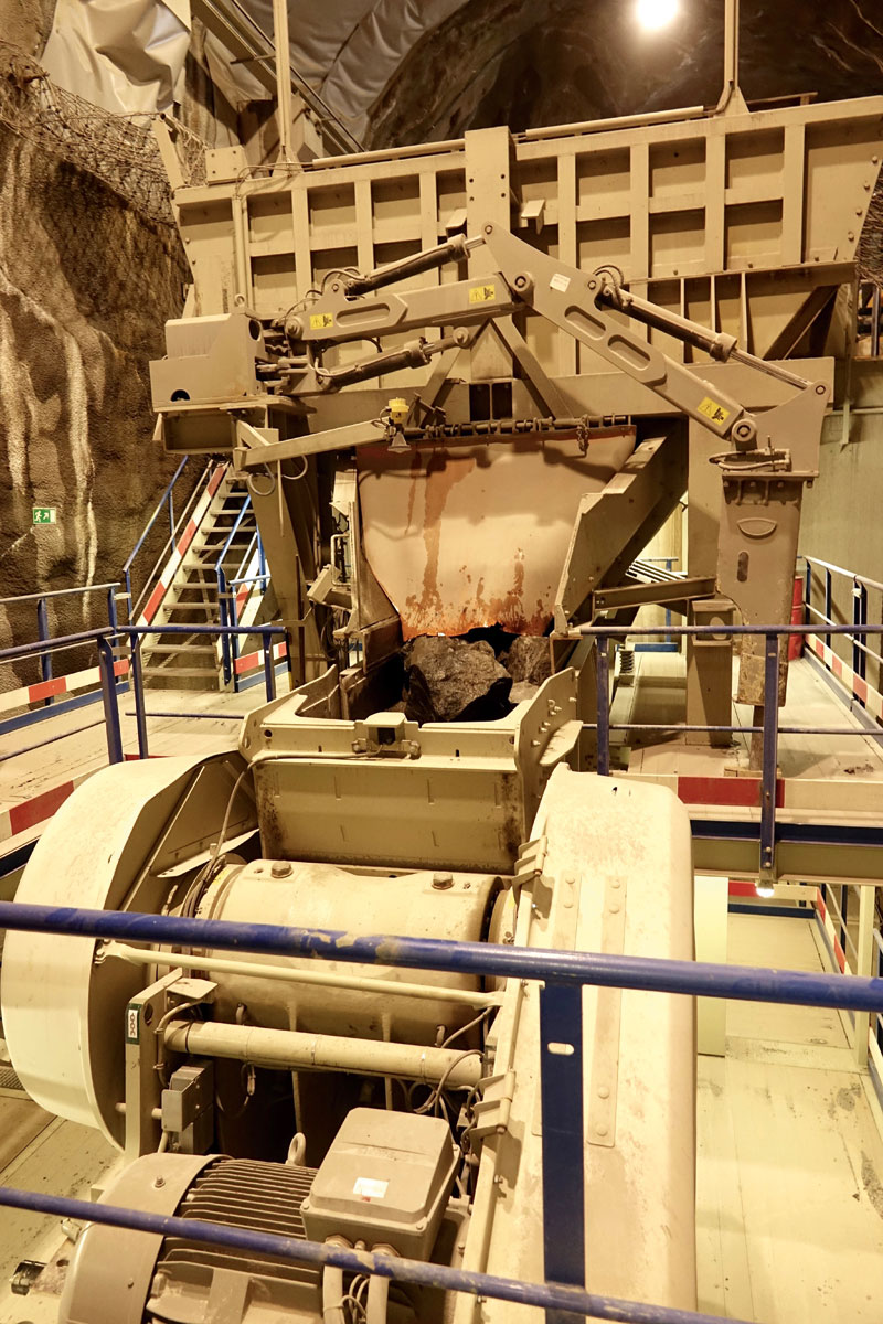 Der Vorbrecher C120 verarbeitet aktuell 350 t/h Material. Durch die Flaschenhalssituation eines Landbandes lassen sich allerdings zur Zeit lediglich 170 t/h direkt verarbeiten. Das restliche Material gelangt durch den Ausbau der Kaverne in ein Zwischendepot, um zu einem späteren Zeitpunkt von dort aus weiter verarbeitet zu werden. Etwa 80 t der sofort zu verarbeitenden Menge aus dem Vorbrecher entfallen direkt auf die weitere Verarbeitung zu Bahnschotter. Dank eines direkten Gleisanschlusses lässt sich das Material direkt verladen. §