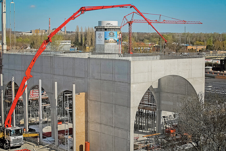 In Ungarns fünftgrößter Stadt Pécs entstand der Rohbau einer neuen Markthalle mit moderner und doch klassischer Architektur, linear und luftig, bestehend aus zahlreichen Arkaden. Das mit der Stahlbetonkonstruktion beauftragte Budapester Unternehmen B. Build & Trade setzte das Wandschalungssystem Mammut 350, das Traggerüst MEP sowie Schrägstützen Triplex ein. Die technische Lösung wurde von MEVA Ungarn unter Federführung von Zoltán Oláh entwickelt.