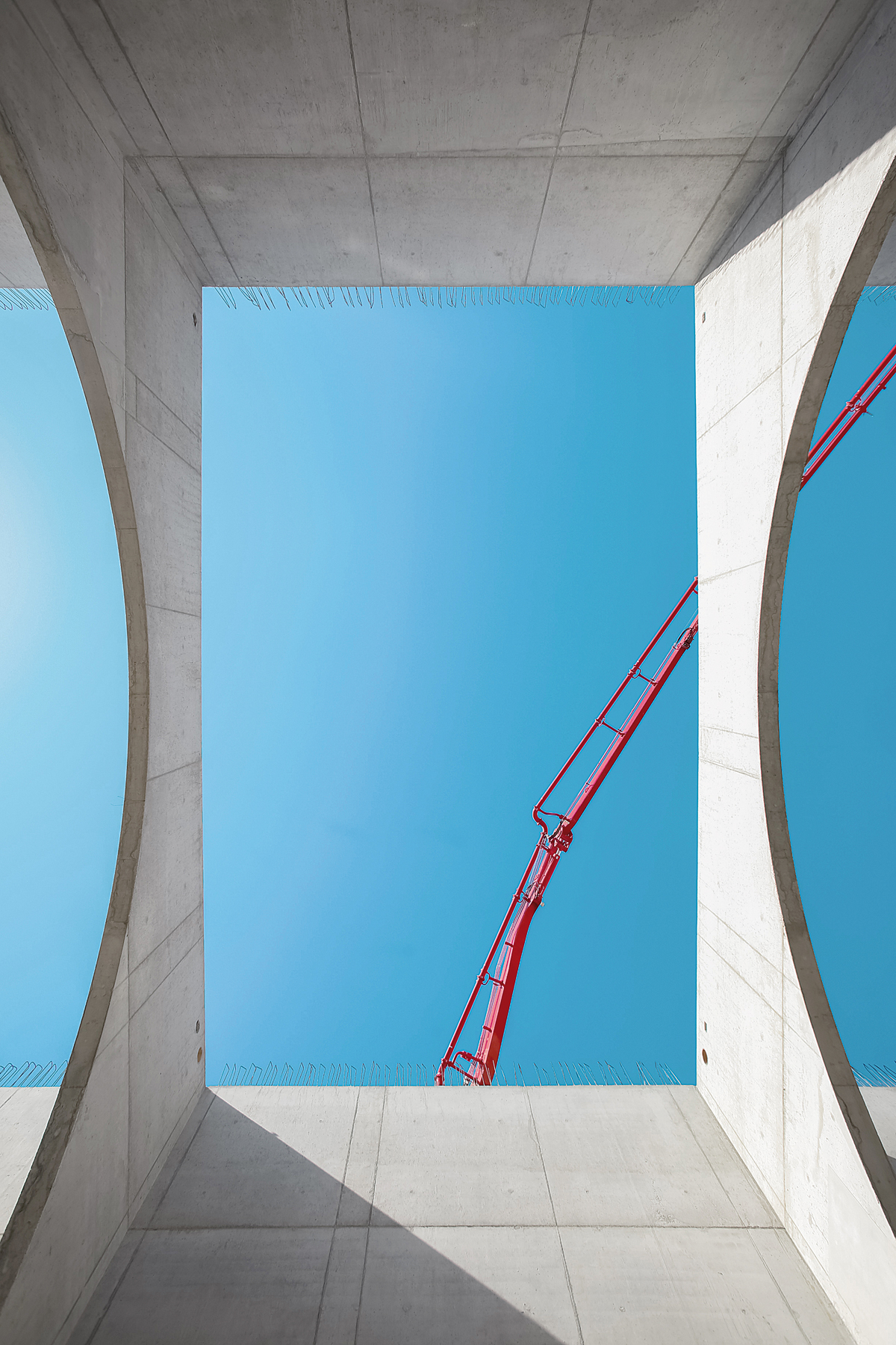 Eine Stärke der Mammut 350 soll bei dem Gebäude besonders zur Geltung kommen: Dank des symmetrischen Anker- und Fugenbildes der Schalelemente, stehend wie liegend, konnten die Oberflächen nach ästhetischen Gesichtspunkten gestaltet werden. Die Schalhaut mit der serienmäßig integrierten Alkus-Vollkunststoffplatte gewährte während der gesamten Bauzeit und an allen Wänden ein homogenes Erscheinungsbild der Sichtbetonoberflächen. Darüber hinaus erwiesen sich die einfache Reinigung und Ausbesserung der Alkus-Platte als zeitsparende Vorteile.