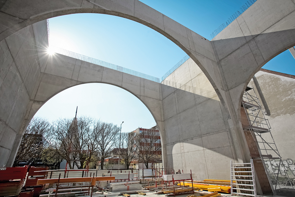 Je zwei halbkreisförmige Stahlgittergewölbe mit 13,6 m bzw. 8,1 m Breite, vom Rohbauer Tura Group in Eigenproduktion angefertigt, wurden in 4 m Höhe zwischen den Oberkanten der Fertigbetonpfeiler auf das MEVA-Traggerüst MEP aufgestützt. An und über den Stahlgittergewölben wurden danach große Elemente der leistungsstarken Mammut-350-Schalung montiert. Um die Montagezeiten kurz zu halten, wurden möglichst große Einheiten erstellt, die dann per Kranhilfe zügig zum nächsten Einsatz geflogen werden konnten.