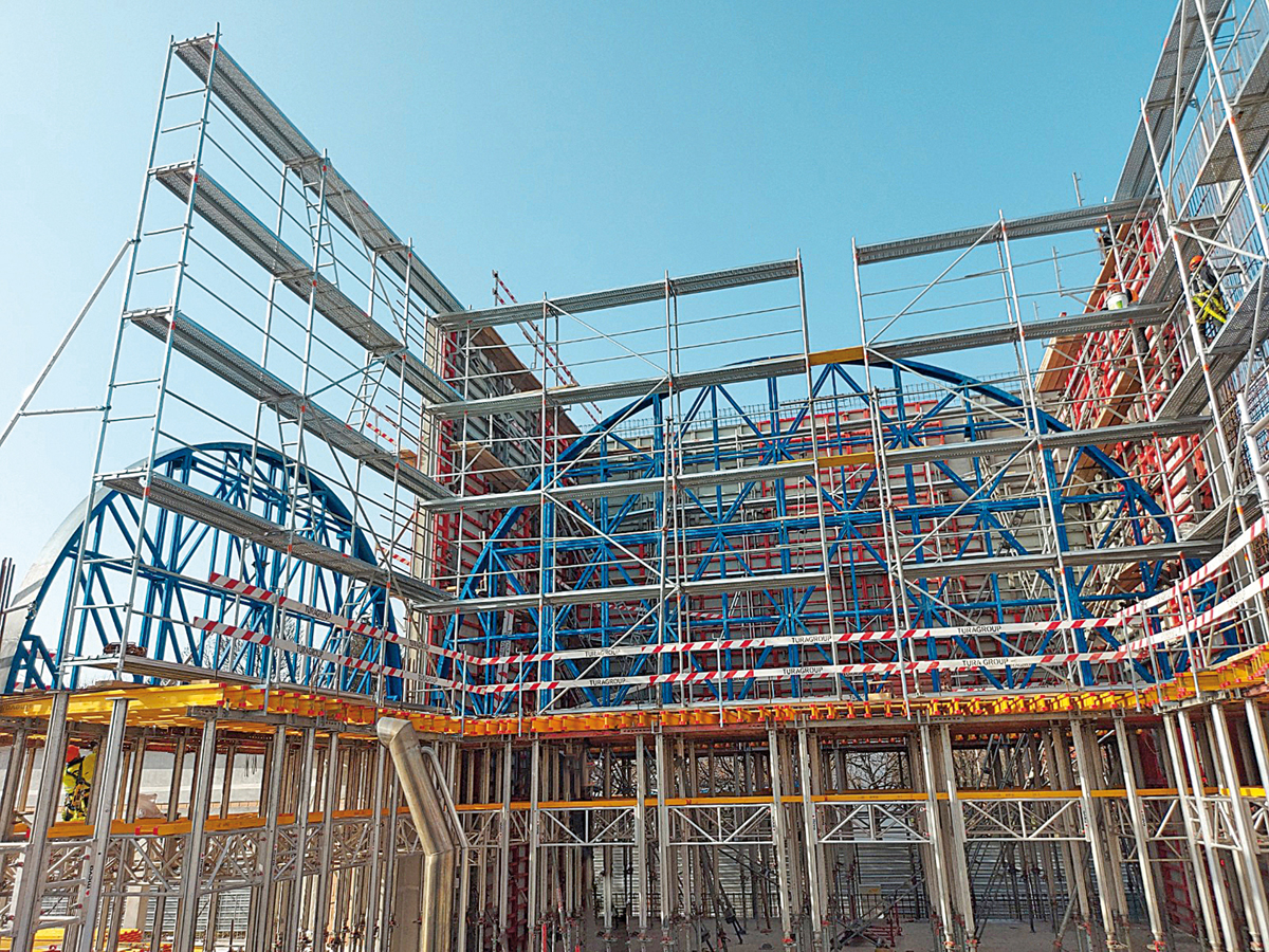 Das modulare Traggerüst MEP sorgte für Sicherheit und Stabilität und stemmte das Gewicht von Stahlgittergewölben, Schalungen sowie betonierten Wänden. Mit der Flexibilität der unterschiedlich großen MEP-Rahmenelemente und einfacher Höhenanpassung konnte das Team der Bauunternehmung B. Build den Aufbau jeweils exakt an der Gebäudegeometrie ausrichten. Da das System aus wenigen Grundteilen besteht, lässt es sich zügig aufbauen und erzeugt keinen engen »Stützenwald«. So verfügen die Anwender über viel Bewegungsfreiheit. Die Sicherung der 13 m hohen Schalungskonstruktionen gegen Horizontallasten wie Wind- bzw. Staudruck wurde souverän durch die modularen Schrägstützen Triplex gewährleistet.