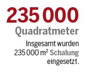 Nach nicht einmal zwei Jahren war der Rohbau fertig. Bis zu 140 Menschen arbeiteten gleichzeitig auf der Baustelle, zwei Ortbetonanlagen lieferten 62 000 m³ Beton. 9 300 t Bewehrung und 235 000 m² Schalung wurden eingesetzt. Umso erstaunlicher, dass die Baustellenplanung komplett papierlos und über 3D-Modelle per Building Information Modeling (BIM) erfolgte. 20 Tablets waren auf der Baustelle im Einsatz und so hatten Poliere sowie Vorarbeiter stets die aktuellen Pläne griffbereit. Als Informations- und Besprechungspunkte dienten fünf auf der Baustelle verteilte »BIM-Plan-Hüsli«, Planhäuschen mit integrierten Monitoren.
