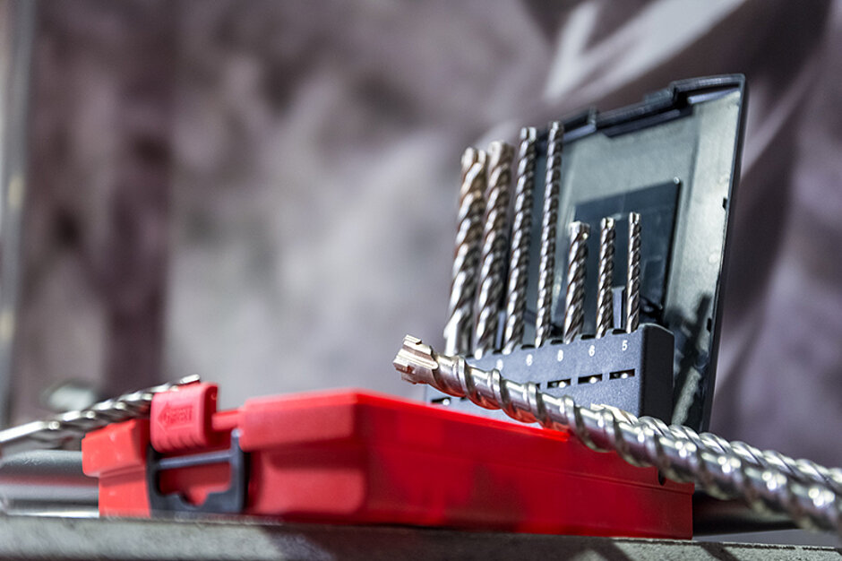 Die MX4-Hammerbohrer gibt es einzeln in Durchmessern von 6 bis 32 mm und in Längen von 110 bis 1000 mm. Eine siebenteilige Kassette beinhaltet gängige Größen von 6 bis 12 mm Durchmesser.