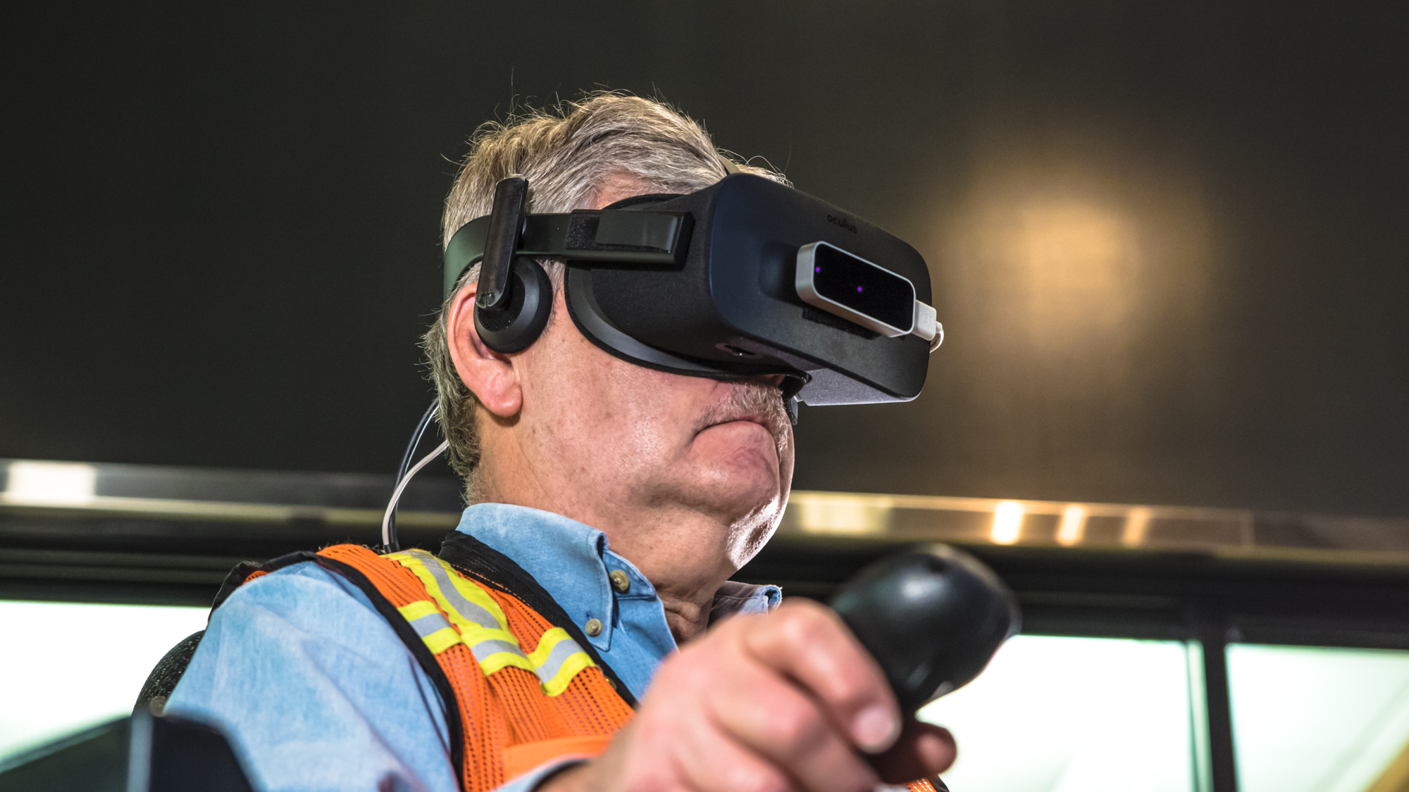 Bei klassischen Simulatoren sitzt man in einem offenen Raum auf einem Sitz vor Bedienelementen und schaut auf einen Bildschirm, der einen abstrakten Blick aus der Baumaschine heraus vermittelt. Die Wahrnehmung erfolgt über den Monitor. Doch bei dem Fahrerstand von Cat gibt es eine Motion-Plattform: Typische Cat Konsolen und ein Original- Fahrersitz samt Sicherheitsgurt sowie ein VR-Set sollen für ein möglichst realitätsnahes Fahrgefühl sorgen.
