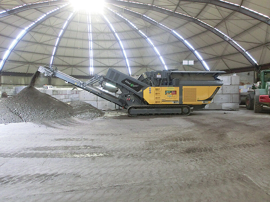 Da die alte stationäre Aufbereitungsanlage nicht mehr auf dem Stand der Technik war und aus Emissionsgründen eine Aufbereitung in einer Halle so nicht mehr durchführbar war, musste ein neues Brechkonzept her. Auf der letzten Steinexpo begannen die ersten Gespräche von Humbert mit Christophel, dem langjährigen Partner für mobile Sieb- und Brechanlagen. Die Entscheidung fiel auf die mobile Brechanlage RM 100 TWO GO! von Rubble Master aus dem österreichischen Linz. Das Grundgerüst dieser Anlage bildet die raupenmobile 30-t-Prallbrechanlage RM 100 GO! – das Besondere an dieser Maschine ist jetzt jedoch ihr Hybrid-Antriebskonzept. Angetrieben wird die RM 100 TWO GO! entweder über den bekannten Dieselantrieb (beispielsweise auf Baustellen) oder über einen zusätzlich an der Anlage integrierten rein elektrischen Antrieb über eine externe Einspeisung. Der 220 kW starke Elektromotor treibt die Anlage störungsfrei an. Ein Frequenzumformer sorgt für eine sparsame Anlaufstromabnahme von 440 kVA, und ermöglicht eine stufenlose Regulierung der Rotordrehzahl. Somit kann die Anlage in der Rundhalle mit dem elektrischen Antrieb arbeiten. Das gilt als deutlich kostengünstiger, ist abgasfrei und geräuscharm. Für die anfallenden Einsätze außerhalb der Rundhalle wird die Anlage dann auf Dieselbetrieb umgestellt und kann autark arbeiten.