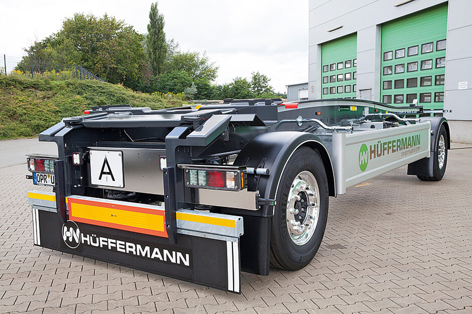 Wahlweise auch mit einer zwillingsbereiften SAF-Achse des Typs Intradisc baut Hüffermann in der Produktlinie Blue Line einen besonders nutzlastoptimierten Anhänger zum Transport schwerer Container