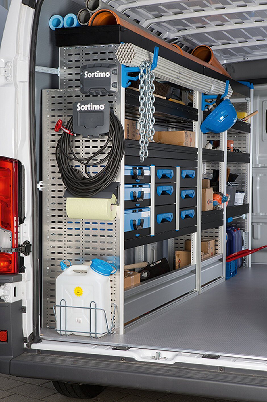 Sortimo HD steht für »Heavy Duty« und benennt damit eine Fahrzeugeinrichtung, die besonders extremen Belastungen standhält. Die Regal- und Fachböden sind ausgelegt für Ladung bis zu 120 kg. Die Frontklappen ermöglichen es, schwere Maschinen und Werkzeuge sicher und platzsparend in den Regal- und Fachböden aus Faserverbundmaterial zu verstauen. Auch die Schubladen von Sortimo HD sind besonders robust und können Ladung bis zu 90 kg aufnehmen. Weil Sortimo HD im gleichen Raster wie die bewährte Globelyst-Einrichtung von Sortimo aufgebaut ist, passt die komplette Vielfalt an Boxxen, Koffern und Zubehör auch in die Fahrzeugeinrichtung für robuste Einsätze.