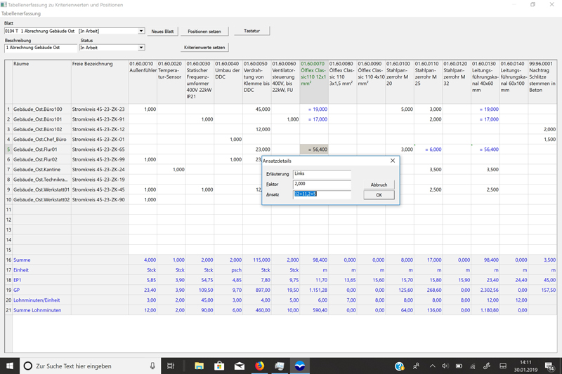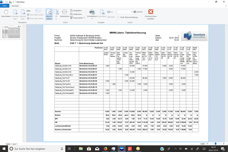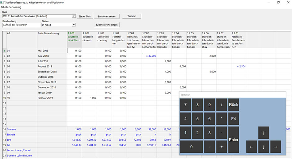 Der Anwender erstellt auch neue Tabellen aus vorhandenen. Dabei entscheidet er, ob das System Preise und Kalkulationsvorgaben darstellt. Alle Vorgaben sind veränderbar. Dabei kann er auch neue Positionen und Kriterien, wie zum Beispiel Räume erfassen. Das Programm legt automatisch Nachtragspositionen als vorläufige Positionen an. Zur Bearbeitung bietet MWM-Libero eine eigene virtuelle Tastatur, die nur die für die Erfassung notwendigen Tasten aufweist. D.h. der Tablet-Modus muss nicht eingeschaltet werden. Bei ähnlichen Positionen können zwecks Zeitersparnis sämtliche Eingabedaten kopiert werden.