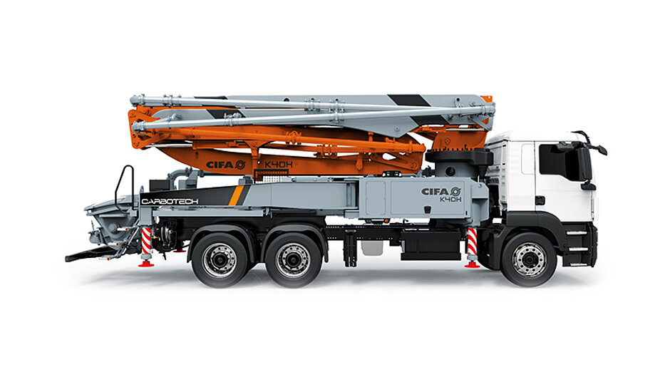 Beim neuen Modell K40H Carbotech besteht ein Teil des Mastes aus Kohlefaserverbundwerkstoff. Dadurch kann die K40H mit einen 5-Arm-Verteilermast in RZ-Faltung eine Reichhöhe von 40 m erreichen. Zur Vollausstattung der Maschine zählt das Smartronic-Gold-Maschinen-Managementsystem, das mit ASC auch eine vollflexible CIFA-Stabilitätskontrolle beinhaltet. Teil der Ausstattung ist zudem eine 1608-EC-Pumpeinheit mit elektronischer Steuerung sowie einer Maximalfördermenge von 160 m³/h und einem maximalen Betonförderdruck von 80 bar.