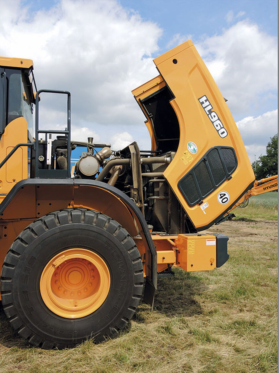 Herzstück des Antriebsstranges aller Hyundai-HL-Radlader sind Motoren nach Tier IV Final von Cummins (HL955 – siehe auch Kasten auf Seite 44/HL960) und Scania (HL970/HL980), die sowohl bei der Kraftstoffeffizienz, dem Drehmomentverlauf und der Verfügbarkeit höchste Ansprüche erfüllen wollen. Bei der neu konzipierten Kabine der HL-Reihe ist die große um 90° schwenkbare Tür nun links (vorne) angeschlagen, was den Eintritt erleichtert. 80 mm Breiten- und 32 mm Längenzuwachs bietet die serienmäßig klimatisierte und großflächig verglaste, vibrationsgedämpft montierte ROPS/FOPS-Kabine. Serienmäßig bedient der Fahrer das Hubgerüst mit einem Joystick. Minihebel (Fingertipps) sind Option, ebenso wie eine Joysticklenkung.