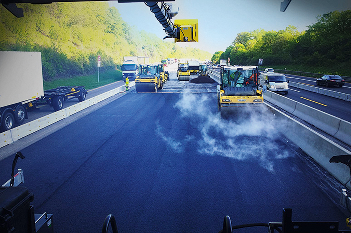 Hand in Hand geht die Herausforderung, das eingebaute Material nur im richtigen Temperaturfenster und über die gesamte Einbaubreite gleichmäßig zu verdichten. Überverdichtung in der Mitte oder Unterverdichtung in den Randbereichen wären fatal für den Baustellenerfolg wie Überfahrten bei zu kaltem oder zu warmem Mischgut.