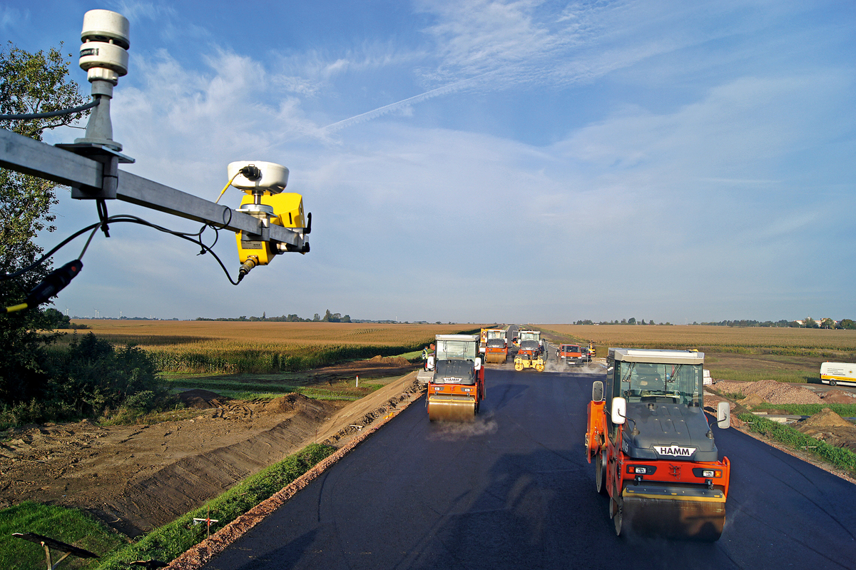 Für den Straßenbau ergeben sich mehrere Optimierungsmöglichkeiten. Eine perfekte Ebenheit ab der untersten Schicht bedeutet weniger Material, mit dem eventuelle Unebenheiten ausgeglichen werden müssen. Hat man die aktuell tatsächlich aufgebrachte Schichtdicke stets im Blick, dann kann die »Sicherheitsreserve« reduziert werden. Die Anzeige der Mischguttemperatur vom Asphaltmischwerk bis hinter die Bohle hilft, thermische Entmischungen rechtzeitig zu erkennen und gegenzusteuern. Zu guter Letzt erleichtert die flächendeckende Verdichtungskontrolle die Verdichtung im optimalen Zeitfenster mit der richtigen Anzahl der Überfahrten. Alle Arbeitsschritte können dokumentiert werden, um später einen Qualitätsnachweis zu liefern und die Abrechnung zu erleichtern.