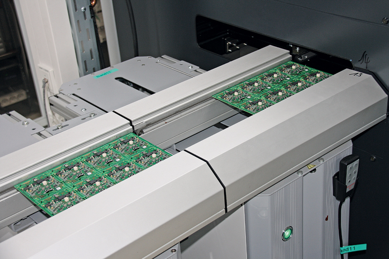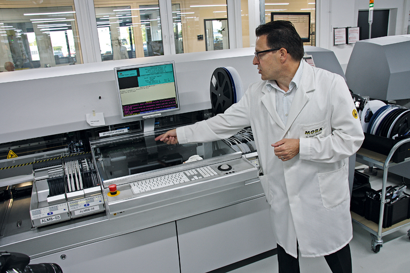 Aber gerade weil die MOBA im Bereich der mobilen Automation unterwegs ist, bedarf es neben neuer Ideen und Entwicklungen einer hoch spezialisierten Fertigung, bei der modernste Technologie zum Einsatz kommt. So verwendet MOBA beispielsweise bei der Herstellung elektronischer Leiterplatten eine spezielle SMD-Bestückungsanlage (siehe auch Kasten »Fakten« auf Seite 30), mit der alle benötigten Systemkomponenten auf die Oberfläche aufgebracht werden können.