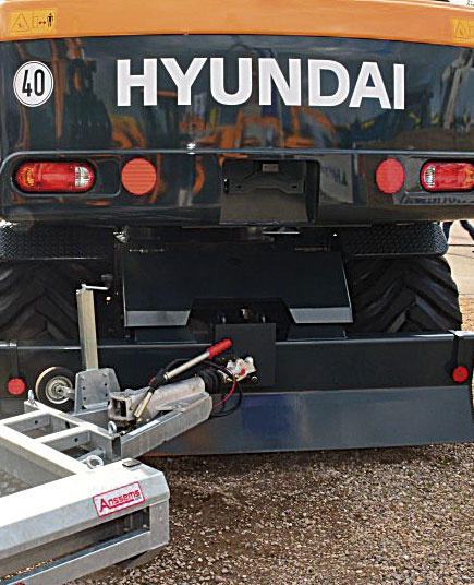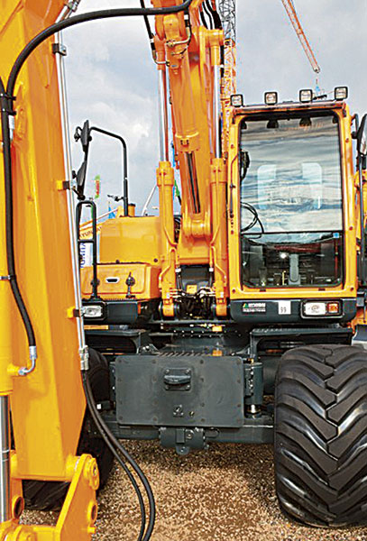 Hyundai bietet derzeit drei Mobilbagger der 9-Serie in der neusten Ausführung (9-A-Serie mit Euro IIIb-Motoren): R140W-9A (13 700 kg, 107 kW), R180W-9A (17 300 kg, 123 kW) und R210W-9A (20 500 kg, 129 kW). Die modernen Universalisten sind vielfältige Ausrüstungsträger – alle können auf der Straße verfahren, da der Achsdruck unter 10 t pro Achse bleibt. Sparsame Cummins-Motoren, Open-Center-Hydrauliksystem und die für alle Modelle angebotene isolierte und großflächig verglaste Kabine mit Joysticks und leichter Servolenkung stehe, so berichtet Reeker weiter, bei den Fahrern hoch im Kurs. Power-, Work- und User-Mode adaptieren die Maschine an Grab-, Hebe-, Abbruch- und Spezialeinsätze wie etwa das Arbeiten mit Mähwerken. Im User-Mode kann der Fahrer Maschinenleistung, Geschwindigkeiten und Regelbereiche von Pumpen nach den Anforderungen des Anbaugerätes wählen.Das Travel-System erlaubt bequemes Verfahren auf der Straße mit konstanter Geschwindigkeit – außerdem kann die pendelnde Vorderachse gesperrt werden, was Wank- und Nickbewegungen reduziert. Zusätzlich kann der Fahrer entscheiden, ob er die Vor- und Rückwärtsfahrt per Pedal oder Joystick wählt.
