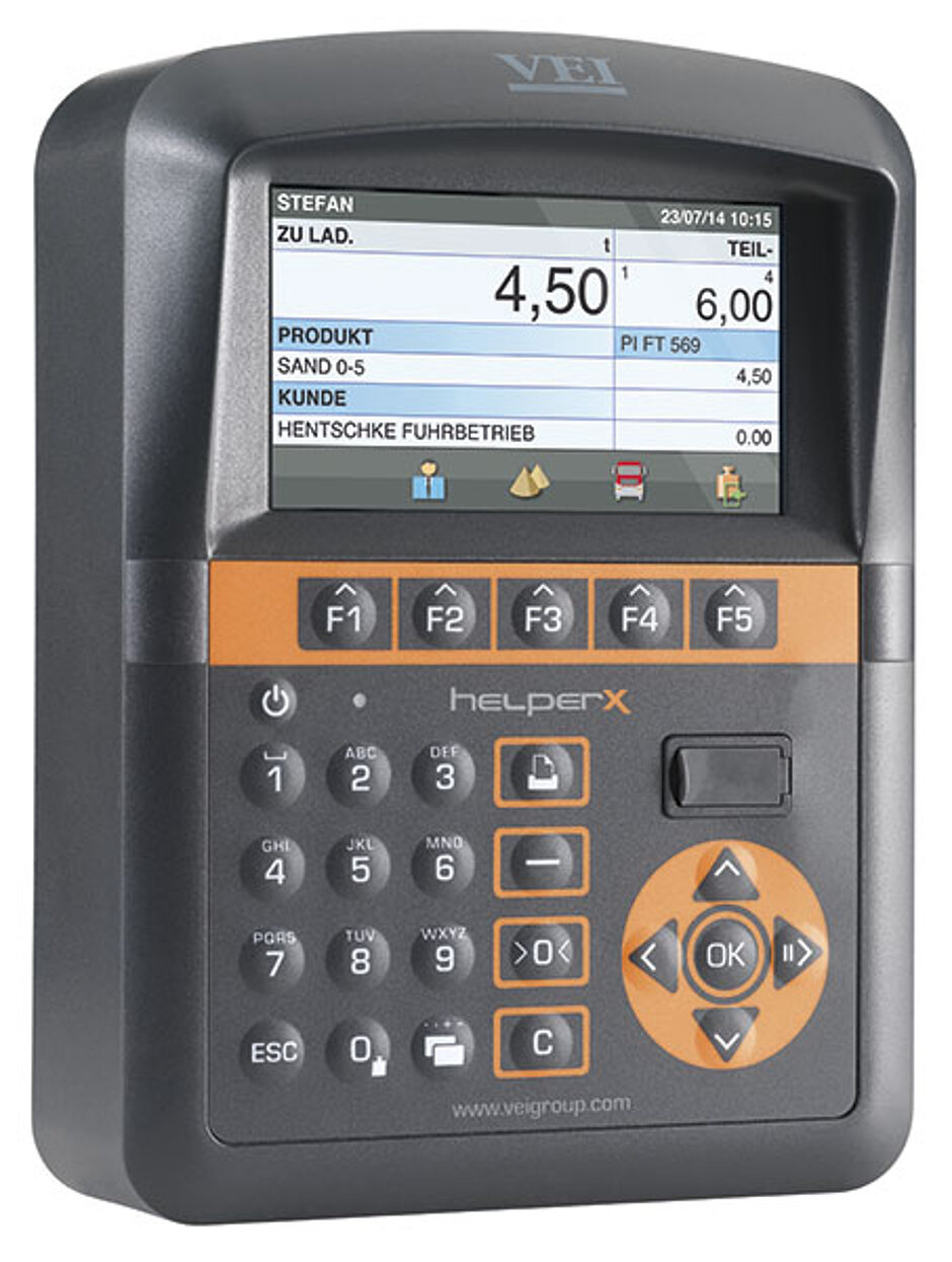 Bei der VEI-Lösung identifiziert sich der ankommende Fahrer am Eingang mit dem Kennzeichen seines Fahrzeugs, gibt das gewünschte Produkt und gegebenenfalls Baustelle und Kunde ein. Das System sendet diese Daten sowie das (im System gespeicherte) Zielgewicht an den Radlader, der für das relevante Produkt zuständig ist, und gibt die Zufahrt frei. Der Radladerfahrer hat die Informationen in seiner Waage verfügbar, ruft das Fahrzeug auf und belädt es. Anschließend werden die Daten zum Ausgang gesendet, wo der Radladerfahrer auf einem Touchpad unterschreibt und einen Ausdruck der Wiegenote erhält. Alle Daten können exportiert und so dem Rechnungssystem zur Verfügung gestellt werden.Nicht nur eine High-End-Lösung, sondern auch einfache Wiegeaufgaben sollen mit VEI-Waagen geradezu mit Bravour bewältigt werden können: Die Produktfamilie Millennium 5 – Helper X soll sich dabei VEI-typisch durch Ergonomie, Präzision, Langlebigkeit und Zuverlässigkeit auszeichnen. Das verbaute Farbdisplay sorgt auch dank der sich automatisch der Umgebung anpassenden Hintergrundbeleuchtung für gute Ablesbarkeit; die Menüführung ist einfach und übersichtlich.