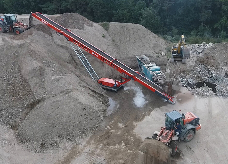 Die Bauwirtschaft boomt – und mit ihr auch die Recyclingbranche. Der Aufbereitung von Bauschutt kommt eine stetig steigende Bedeutung zu. Erfolgreich mit dem Markt wächst auch das Dienstleistungsunternehmen Sascha Schitthelm (DLU) kontinuierlich. Vor 10 Jahren begann Sascha Schitthelm in seinem 2004 gegründeten Recyclinghof in Brüggen-Bracht am Niederrhein mit der Aufbereitung von Bauschutt. Seither hat sich der damit verbundene Materialumschlag auf bis zu 12.000 t im Monat gesteigert. Da wurde es Zeit, die betriebsinternen Umschlagarbeiten auf ihre wirtschaftliche Effizienz hin zu überdenken, wie sich Firmenchef Schitthelm erinnert: „Auf unserem bis jetzt auf eine Größe von 32.000 m2 angewachsene Betriebshof erwies sich die konventionelle Bewegung des gebrochenen Gutes über Radlader irgendwann als ausgereizt.“ Das hatte gleich mehrere Gründe. Zuvorderst war ein teures Gerät samt Fahrer ständig gebunden. Dazu entwickelten sich die die Prioritäten im Platzmanagement. Mit dem Radlader lassen sich im ersten Schritt nur Haldenhöhen von etwa 3 m anlegen. So wachsen die Ablageflächen unweigerlich in die Breite – mindestens bis eine Größe erreicht ist, auf der das Fahrzeug zeitaufwändig Rampen anlegen kann um höher zu kommen. Der Unternehmer braucht in der Regel den knappen Platz für die Materialannahme und als Rangierfläche für die Lkw – Haldenpuffer wachsen daher am besten in die Höhe – nicht in die Breite.