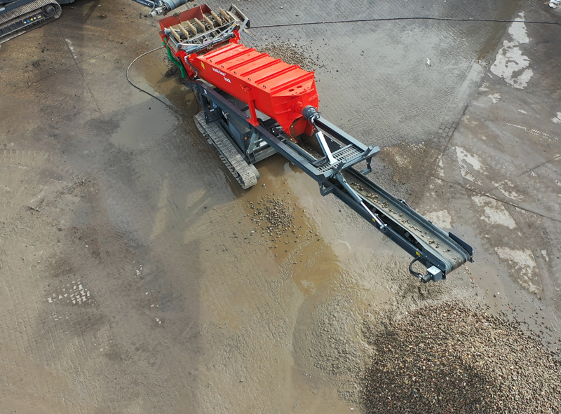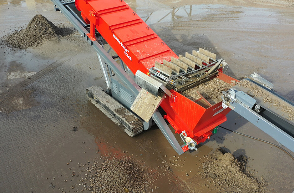 Neben der Verfahrenseffizienz überzeugt auch der wash-bear® track insbesondere mit der einfach zu handhabenden Anlagentechnik sowie der robusten, wartungsfreien Ausführung, die der Anwender bereits aus der wash-bear® -Serie kennt. Ein herkömmlicher hocheffizienter Stage-V-Deutzmotor treibt das Fahrwerk sowie die gesamte Anlage dieselhydraulisch an. Das Antriebskonzept sichert in Konstruktion und Verarbeitung den Betrieb im Spritzwassereinfluss. Die bis ins Detail durchdachte Weiterentwicklung berücksichtigt auch den Transport zu auswärtigen Baustellen, wo in Zukunft hochwertiges Recycling auf Baustellen eine wachsende Bedeutung erlangen wird. So kann der Windsichter auch während des Transportes aufgesetzt bleiben. Dadurch reduzieren sich die Rüstzeiten am neuen Einsatzort, ebenso wie durch das hydraulisch ausklappbare Austragsband.