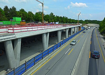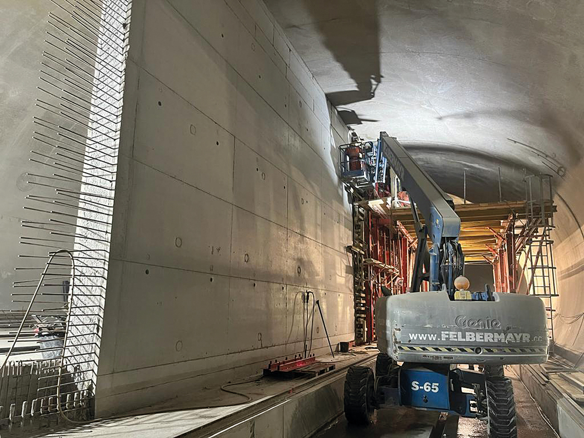 Für den Betoneinbau werden vier Schalsätze von Peri auf GT24-Trägerbasis genutzt. Jeder Schalsatz ist zweihäuptig ausgeführt und hat eine Länge von 12,7 m. Der brandschutzbeständige Faserbeton wird über Betonierstutzen in die Schalung eingepresst.