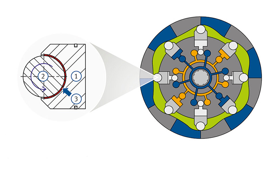 Das Prinzip des Radialkolbenmotors ist einfach: Die Kolben werden hydraulisch verschoben und der hydraulische Druck wird über Rollen auf eine Kurvenbahn übertragen. Dadurch wird eine Radialkraft erzeugt, die in eine Drehbewegung überführt wird. Sie werden beispielsweise in Baumaschinen zur Turmdrehung eingesetzt, bei denen ein sanftes Anfahren der großen Massen notwendig ist.