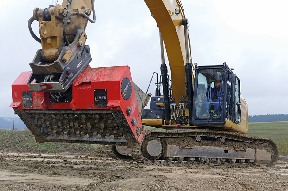 Beim MTS-Anbauverdichter, ebenso wie bei den anderen Anbaugeräten von MTS, kann der Mann im Graben weitgehend entfallen und wird damit für andere Aufgaben frei. »Wenn gutes Personal knapp wird, ist man ohnehin froh, möglichst viele Gewerke mit nur einem Mann abwickeln zu können. Ebenfalls spielt hier der Faktor Sicherheit eine große Rolle, da der Mann im Graben nicht mehr dauerhaft einem Risiko ausgesetzt ist«, ergänzt Efinger. Das gelte beispielsweise auch für das Verfügen von Rohren mit unseren MTS-Rohrschiebeadaptern, von denen wir allein auf dieser Baustelle drei im Einsatz haben.«Einen weiteren Zeitvorteil verschafft dem Efinger-Team der neue MTS-Bodenrecycler: »Er erlaubt uns mittels dosierter Beimengung von Bindemittel den Wiedereinbau von anstehendem Boden in einem Arbeitsgang. Dadurch sparen wir uns auch die teuren Deponiegebühren und das Geld für Fremdmaterial. Wegen des damit verbundenen Preisvorteils von bis zu 15 % setzen wir bei praktisch allen Erschließungsmaßnahmen auf die Bodenaufbereitung.«