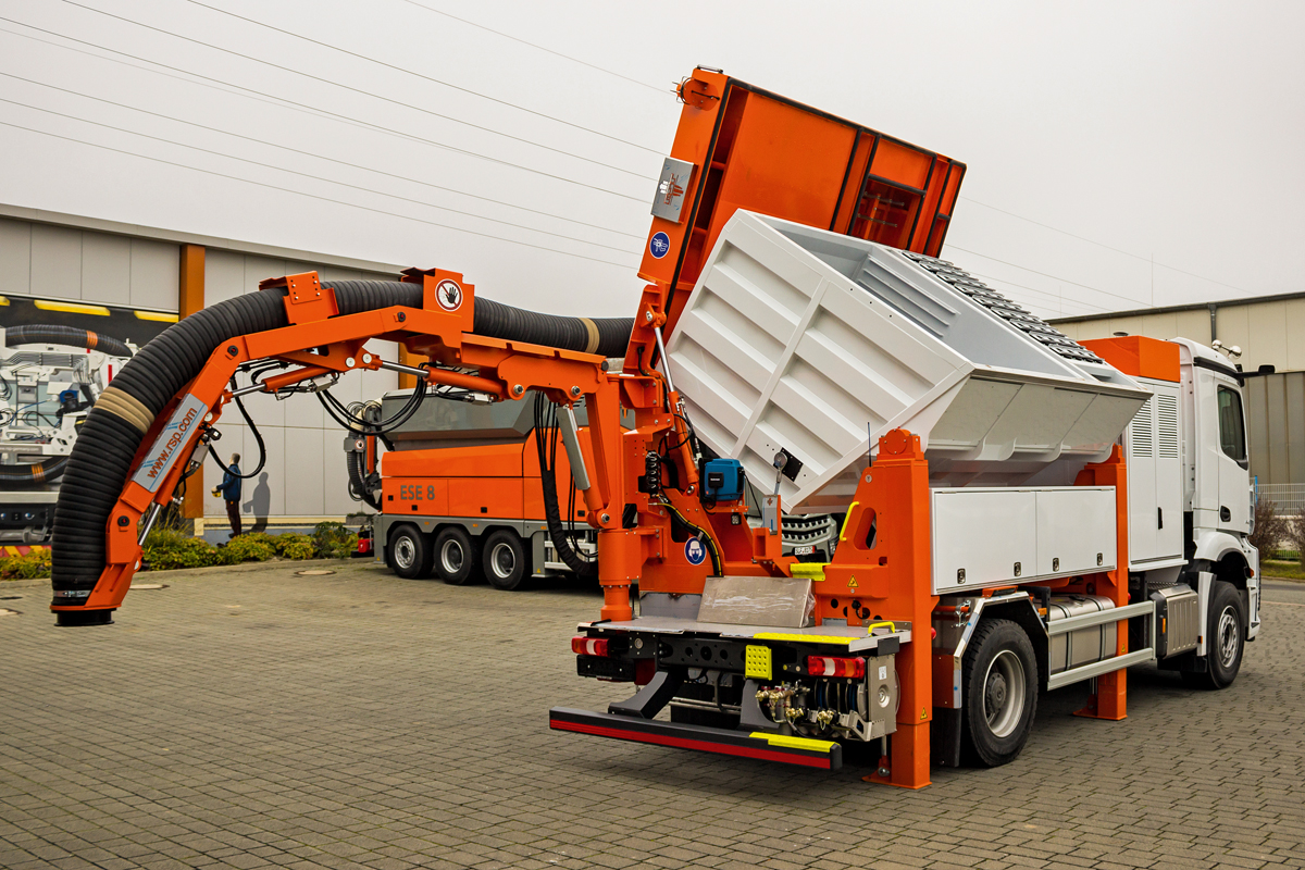 Bei RSP stehen wiederum die Saugbaggermodelle der ESE-Serie im Mittelpunkt. Den Anfang macht hier der ESE 4: Aufgrund seiner geringen Abmessungen und der installierten Saugleistung ist er ideal für den innerstädtischen Tiefbau bei beengten Platzverhältnissen geeignet. Mit einer Gesamtbreite von 2,3 m lassen sich auch enge Straßen befahren. Insgesamt verfügt der kompakte ESE 4 über ein Behältervolumen von 4 m3 bei einer Kippachshöhe von 2,1 m. Grundsätzlich, so RSP, lässt sich der Aufbau des ESE4 auf allen 2-Achs-Chassis (4x2) ab einem Radstand von 4 200 mm, einer Fahrzeugbreite ab 2,3 m und einem maximal zulässigen Gesamtgewicht von 18 t realisieren. Der nächstgrößere ESE 6 gilt als bewährter Allrounder und kommt hingegen auf ein Maximalgewicht von 32 t und kann bis zu 8 m3 an Material aufnehmen – gewählt werden kann bei dieser Ausführung aber auch zwischen mehreren Behältergrößen (6,8 m3 oder 10 m3), zugeschnitten auf den jeweiligen Einsatzzweck. Mit rund 230 kW Motorleistung, einem maximalen Volumenstrom von 44 000 m3/h und einem Gelenkschlauchträger, der einen 180° Schwenkbereich sowie einen Durchmesser von 250 mm aufweist, ist der ESE 6 vielseitig einsetzbar. Der ESE 6 der nächsten Generation wurde zusätzlich überarbeitet und soll neben einem optimierten Maschinendesign mit neuer Behälter- und Deckelgeometrie für eine optimierte Luftführung auch weniger Kraftstoff- bzw. Energieverbrauch vorweisen. Aktuell spricht der Hersteller bei der neuen Generation des ESE 6 von einer Steigerung der Saugleistung von bis zu 20 % gegenüber vergleichbaren Saugbaggern. Ebenso haben laut RSP die verbauten Ventilatoren ein Update erhalten, um den Wartungsaufwand zu verringern.