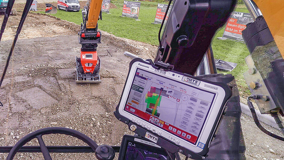 Weiter geht es mit dem zur neuen BaVo3.0 Pro gehörenden CPX-Terminal, mittels dessen sich alle zugehörigen Software-Pakete freischalten lassen. Apps für eine 2D-Steuerung, eine Ansteuerung des Tiltrotators (MTS Control sowie Fremdhersteller) und des MTS-Duo-Verdichters, eine passive Arbeitsraumbegrenzung (ARB), ein in Arbeit befindliches dynamisches Wiegesystem und eine Schnellwechsler-Ansteuerung (OilQuick). »Darüber hinaus lässt sich dann noch die eigentliche 3D-Baggersteuerung aufsetzen: unser MTS-Navi samt aller inkludierten Assistenz-Systeme (Baugrubenassistent, Schüttlagenassistent, Volumenassistent)«, erklärt Bauder weiter. »Die durch den iCANnect-Stecker möglich gewordene CANbus-Kommunikation erlaubt, den Kreis wieder zu schließen, die nahtlose Einbindung von MTS-Automatisierungstechnologien ins MTS-Navi.« So lasse sich die Bewegung vom MTS-Tiltrotator in Echtzeit abbilden.d