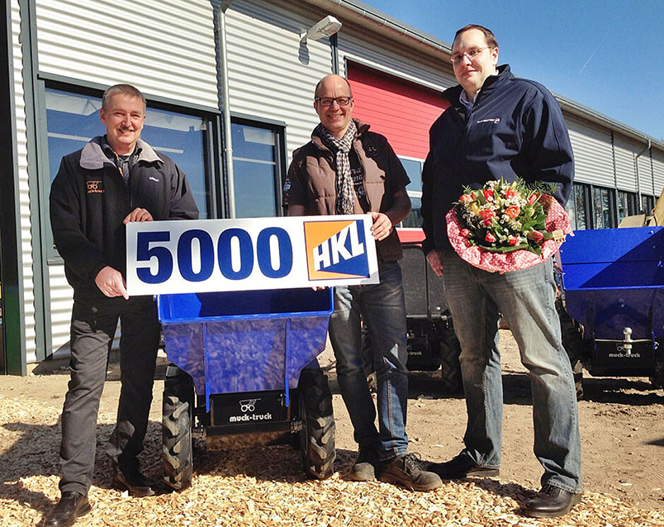 Im Maschinenpark der Firma »Grüne Oase« in Bad Schwartau ersetzt der 5 000. Muck-Truck ein bereits in die Jahre gekommenes Exemplar. Firmeninhaber Norbert Birmes: »Der Muck-Truck ist eine wesentliche Arbeitserleichterung. Diesen zuverlässigen Helfer möchten wir bei unserer täglichen Arbeit nicht mehr missen. Der Muck-Truck ermöglicht bei jeder Transportarbeit, in jedem Gelände und zu jeder Jahreszeit eine kraftschonende und zeitsparende Lösung.« Mit einem permanenten Allradantrieb und seinem Honda-Industriemotor bewältige der Muck-Truck, so unterstreicht Birmes weiter, voll beladen Steigungen bis 40° im extremen Gelände. »Er steigt beladen Treppen hoch; seine Bedienung ist kinderleicht.«